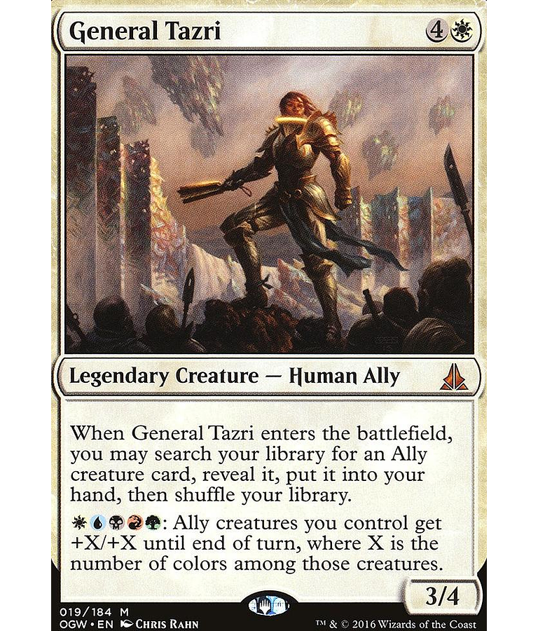 When General Tazri enters the battlefield, you may search your library for an Ally creature card, reveal it, put it into your hand, then shuffle your library. : Ally creatures you control get +X/+X until end of turn, where X is the number of colors among those creatures.