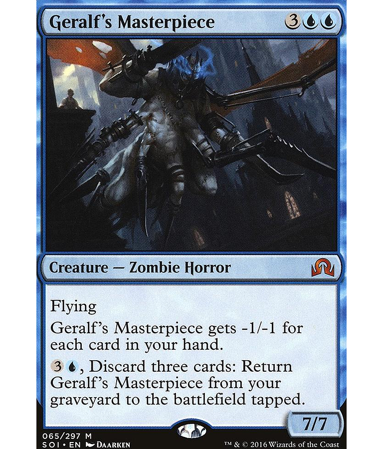 Geralf's Masterpiece gets -1/-1 for each card in your hand. , Discard three cards: Return Geralf's Masterpiece from your graveyard to the battlefield tapped.