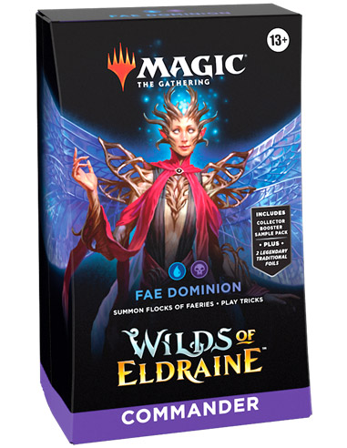 Las tierras salvajes de Eldraine viene con dos mazos commander nuevos donde reina lo místico y la aventura. Estás reservando el mazo Fae Dominion de colores negro y azul. Contiene 100 cartas.