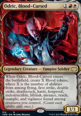 When Odric, Blood-Cursed enters the battlefield, create X Blood tokens, where X is the number of abilities from among flying, first strike, double strike, deathtouch, haste, hexproof, indestructible, lifelink, menace, reach, trample, and vigilance found among creatures you control. (Count each ability only once.)