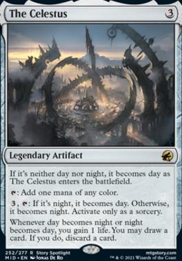 If it's neither day nor night, it becomes day as The Celestus enters the battlefield. : Add one mana of any color. , : If it's night, it becomes day. Otherwise, it becomes night. Activate only as a sorcery.