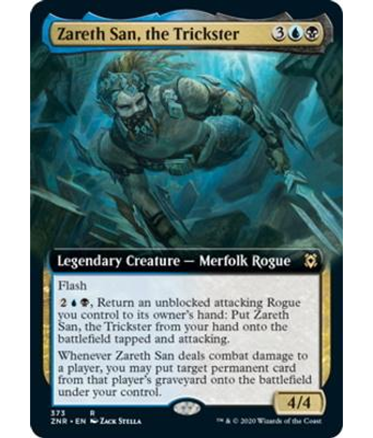 Flash , Return an unblocked attacking Rogue you control to its owner's hand: Put Zareth San, the Trickster from your hand onto the battlefield tapped and attacking.